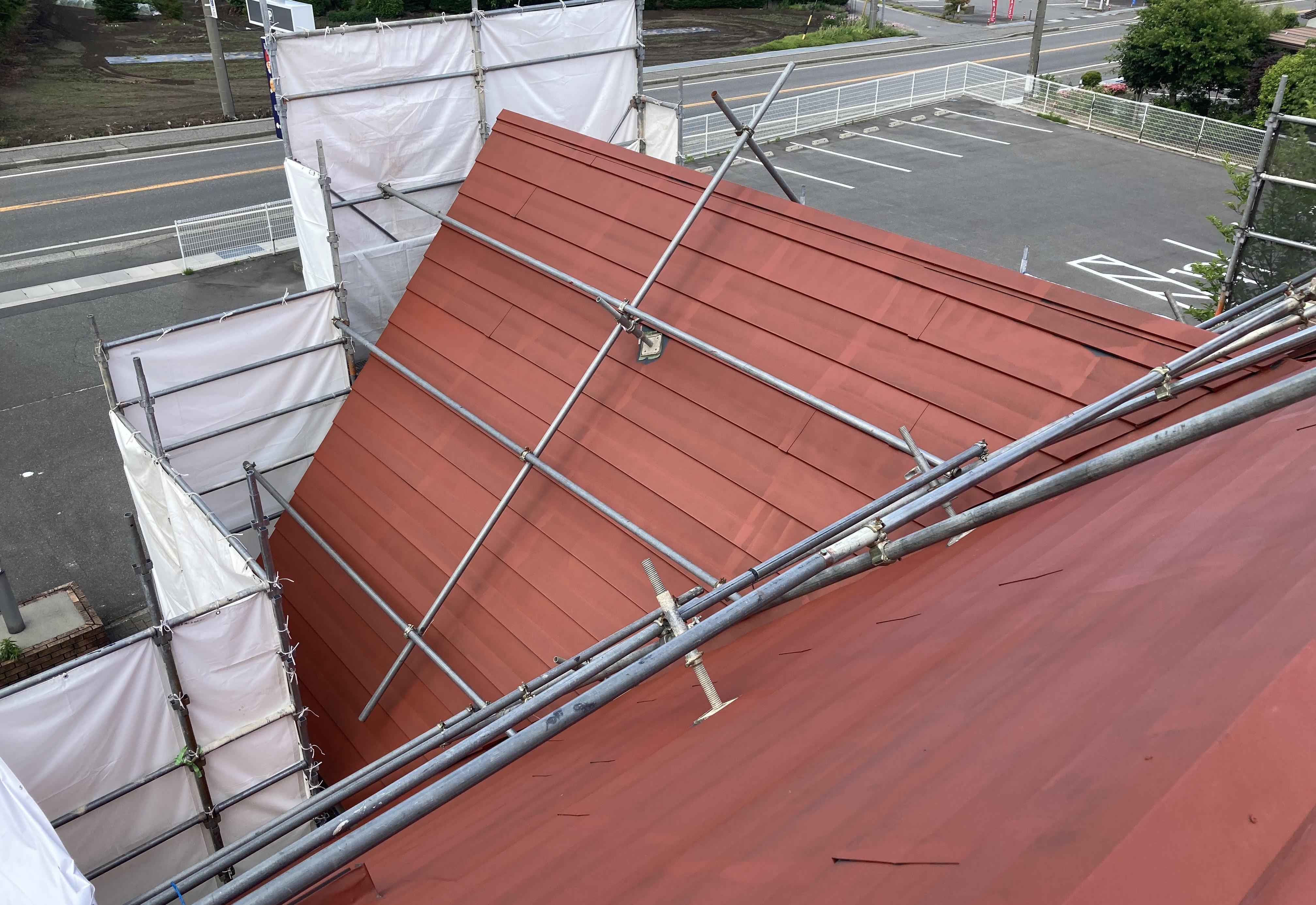【駒ヶ根市 屋根塗装】S様 無機ルーフ塗装 急勾配屋根のため、屋根足場を設置しての安全作業となります。