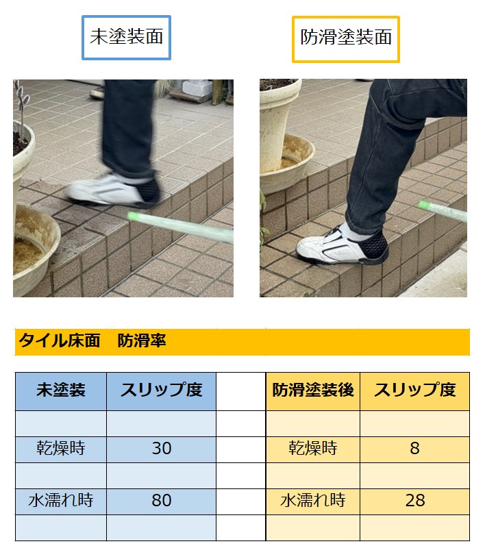 もともとのタイル材に凹凸がありますので、乾燥時にはよほど走ったりしない限りは、滑ることはありません。しかし、降雨時などタイル床面が濡れている場合は滑る率が上昇します。未塗装部での実際の感覚は、濡れた面に駆け足で踏むと、ズルッと滑る状況でした。